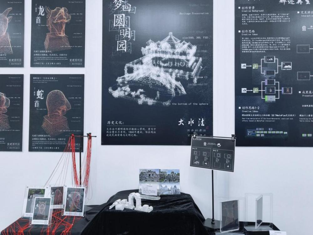 交互展区的作品,以互动性游戏为主,将古代历史文化遗产保护、当代社会热点讨论和未来世界畅想等主题融入游戏之中,让玩家在轻松愉悦的游戏中思考深刻的主题。例如,交互作品《梦回圆明园》,制作了大水法和十二兽首的3D模型,可以通过手势控制大水法模型的放大、缩小、消失和出现,旨在利用实时渲染搭建一座连接过去与现在的桥梁。