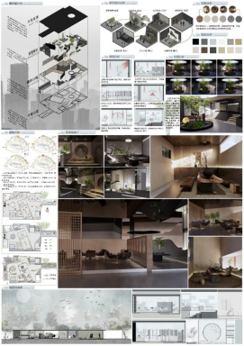 环境设计展区内容丰富多彩、主题多元,其中不乏一些获奖优秀作品。例如,作品《第三次遗忘》聚焦于我国人口老龄化的问题,以电影《寻梦环游记》的生死观为灵感,打造一个专属的用于缅怀与回忆的纪念场地,为墓地纪念空间设计开辟全新思路,该作品获得十三届全国大学生数字媒体科技作品及创意竞赛(国赛)三等奖。作品《静砚茶寮》以新中式风格为基调,融合传统东方美学与现代几何设计语言,打造静谧雅致的品茗空间,构建“刚柔并济”的当代东方意境,实现功能性与艺术性的统一,该作品获得第十三届未来设计师全国高校数学艺术设计大赛(省赛)二等奖。除此之外,《聆音听景,生“声”不息》《CHAIEL·炽焰羊城》《筑境共生》等环设作品,也均在国赛、省赛等大大小小赛事中摘获殊荣。