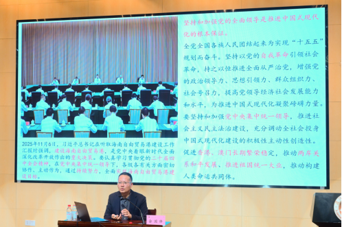 2025年12月9日下午,我校在明德报告厅举办学习贯彻党的二十届四中全会精神专题报告会。莆田学院党委委员、马克思主义学院院长,俞国锋教授受邀作题为《学习贯彻党的二十届四中全会精神》的报告。校党委书记徐志怀出席会议,校党委委员、各党总支委员、党员教师、学生党员代表200多人参加会议。