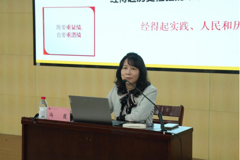 冯霞教授以问题为导向,紧贴高校办学治校实际,从“是什么、为什么、怎么做”三个方面进行阐释,回答了正确的政绩观核心要义和树立践行正确政绩观的重要意义和实践路径。报告指出,政绩观是对政绩的总的看法和根本观点,是一个根本性问题。树立和践行正确政绩观,起决定性作用的是党性。要坚持党性与人民性的统一,实现好、维护好、发展好最广大人民根本利益。政绩是百姓脸上的笑容,是群众看得见、摸得着、用得到的民心工程,一切政绩的归属与意义必须锚定人民。报告强调,为民造福是最大政绩。对高校而言,树立和践行正确政绩观是理论课题,更是实践课题。是政治要求,更是行动自觉。是干部准则,更是教师师德。要始终做到以初心校正政绩观,以民心衡量政绩观,以实干践行政绩观,以清廉守护政绩观,以长远检验政绩观。要坚持功成不必在我,功成必定有我,为人民出政绩,以实干出政绩。要不慕虚荣、不务虚功,不图虚名,真抓实干推动学校内涵式发展,办人民满意的教育,创造经得起实践、人民、历史检验的办学实绩与育人实绩。