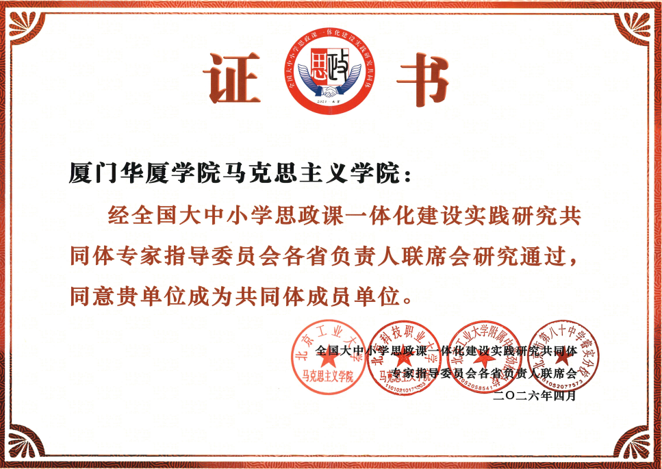 会上,全国大中小学思政课一体化建设实践研究共同体新成员单位名单的发布作为会议首项成果,包括厦门华厦学院马克思主义学院在内的65家覆盖从幼儿园到高校的全学段,涉及基础教育、职业教育、高等教育及科研机构等多个领域新一批成员单位加入共同体。人民日报社理论部部务委员、马克思主义理论与党建编辑室主编王云松,全国大中小学思政课一体化建设实践研究共同体专家指导委员会专家委员、北京青年政治学院纪委书记何裕,全国大中小学思政课一体化建设实践研究共同体专家指导委员会秘书长、北京工业大学马克思主义学院党委书记安哲锋等嘉宾为共同体新成员单位颁发证书。