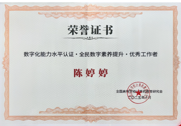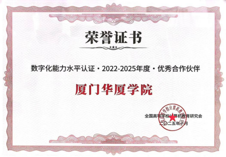 会议表彰了近年在数字教育方面成绩突出的院校和个人。厦门华厦学院荣获由全国高等学校计算机教育研究会颁发的“2022-2025数字化能力水平认证优秀合作伙伴”殊荣,同时我校陈婷婷和严一峰两位老师获“数字化能力水平认证Ÿ全民数字素养提升Ÿ优秀工作者”荣誉称号。
