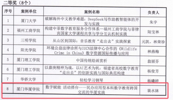 近日,福建省高校在线教育联盟公布数字教育“走出去”典型案例征集结果,厦门华厦学院申报的《数字赋能活动搭台——民办应用型本科数字教育跨国交流的华厦实践》案例荣获二等奖,这是对我校数字化改革与国际化办学的肯定。