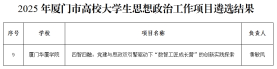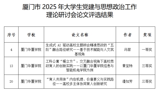 我校在本次评选中取得良好成绩,共获批思想政治工作精品项目立项1项,获奖论文3篇。其中,学生工作部推荐的黄敏凤老师主持申报的《党建与思政的耦合驱动:“四智四融”数智工匠培养模式的构建与探索》获评精品项目立项。在论文评选中,冯翠老师撰写的《生成式AI驱动高校主题班会精准思政的“五阶”融合路径研究——基于技术赋能与人文筑基视角》荣获一等奖;黄宝特老师撰写的《工科公寓“暖立方”:交叉融合视角下高校思政育人的创新实践——以厦门华厦学院信息与智能机电学院为例》和潘如芳老师撰写的《“育人共同体”内在机理、价值要义与实践路径——高校多主体协同育人创新研究》均获三等奖。