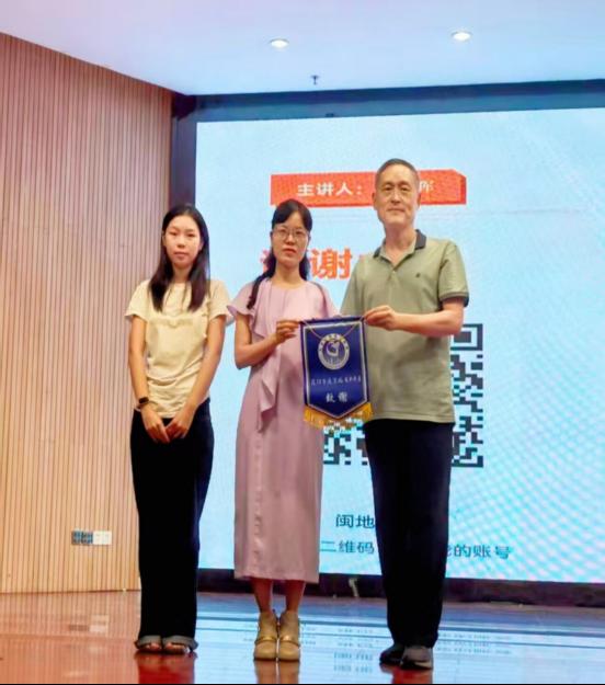讲座结束后,我校通识课程建设委员会主任刘海翔教授为杨秀晖老师颁发致谢旗,并合影留念。